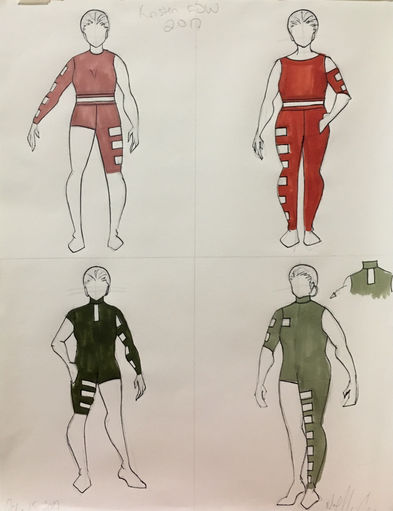 These costumes were designed for a student choreographer at The George Washington University. Their piece explored cult mentality. They requested tight-fitting clothing in dark green and for slight variance between designs, to appear as a unit but not identical. Inspired by prison bars, I incorporated the various cutouts in the design.