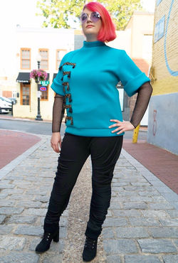 Blue neoprene top with gold buttons and black and gold tassel embellishment, fishnet sleeves, black knit apple peel leggings. Completed Summer 2017.